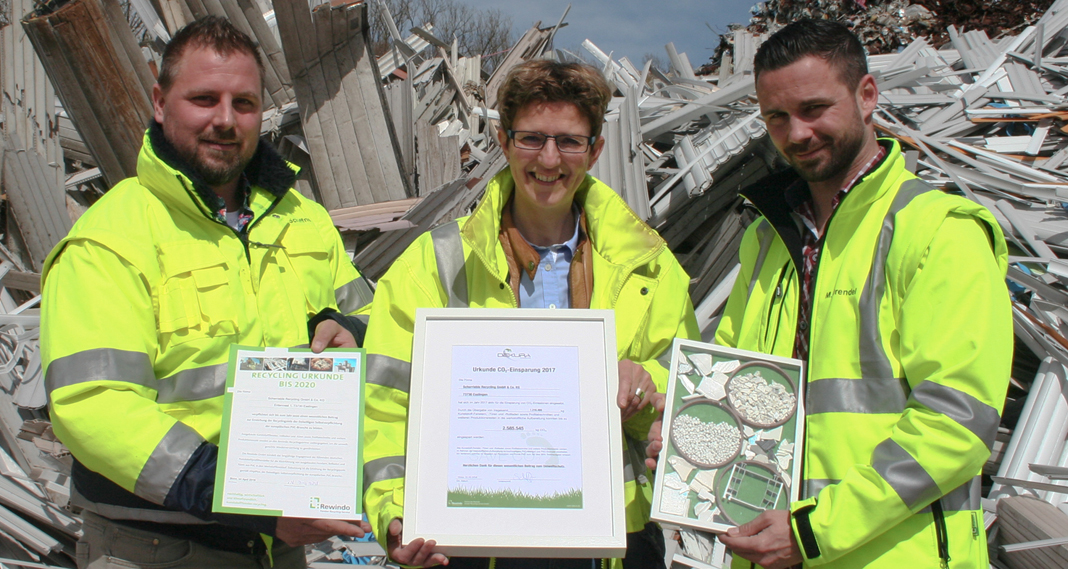 In der Praxis gelangen die alten Esslinger Kunststofffenster schließlich in die moderne Recyclinganlage des langjährigen Rewindo-Recyclingpartners Dekura GmbH im westfälischen Höxter, wo sie zunächst u.a. mittels Schredder zerkleinert werden. Danach folgt durch unterschiedliche Verfahren die sortenreine Trennung von Glasresten, Metallen und Kunststoff. Während etwa Glas, Metalle und weitere Stoffe an andere Recycler für die Wiederaufbereitung weitergeben werden, erfolgt die Verwertung der weitaus größten Fraktion, dem Kunststoff PVC, direkt vor Ort. Hergestellt wird ein hochwertiges PVC-Granulat. In neuen Fensterprofilen ist das Regranulat, ummantelt mit PVC-Neumaterial, dann als Recyclatkern zu finden. Ein Prozess, der mindestens sieben Mal wiederholt werden kann. Extrem nachhaltig also in Sachen Ressourcenschonung, hilft das Recyclingverfahren auch bei der Vermeidung von Treibhausgasen, wie Jörg Schiffner von Dekura zu berichten weiß: „Im Vergleich zur Produktion von Primär-PVC können wir mit unserem Verfahren zum Teil über 89 Prozent Treibhausgase einsparen.“ Dazu tragen dann auch die von Scherrieble gesammelten Altfenster bei – und zwar 2017 mit einer Einsparung von exakt 2.585.545 Kilogramm CO2-Emmissionen. Das hat die Dekura den Esslingern per Urkunde sogar verbrieft.